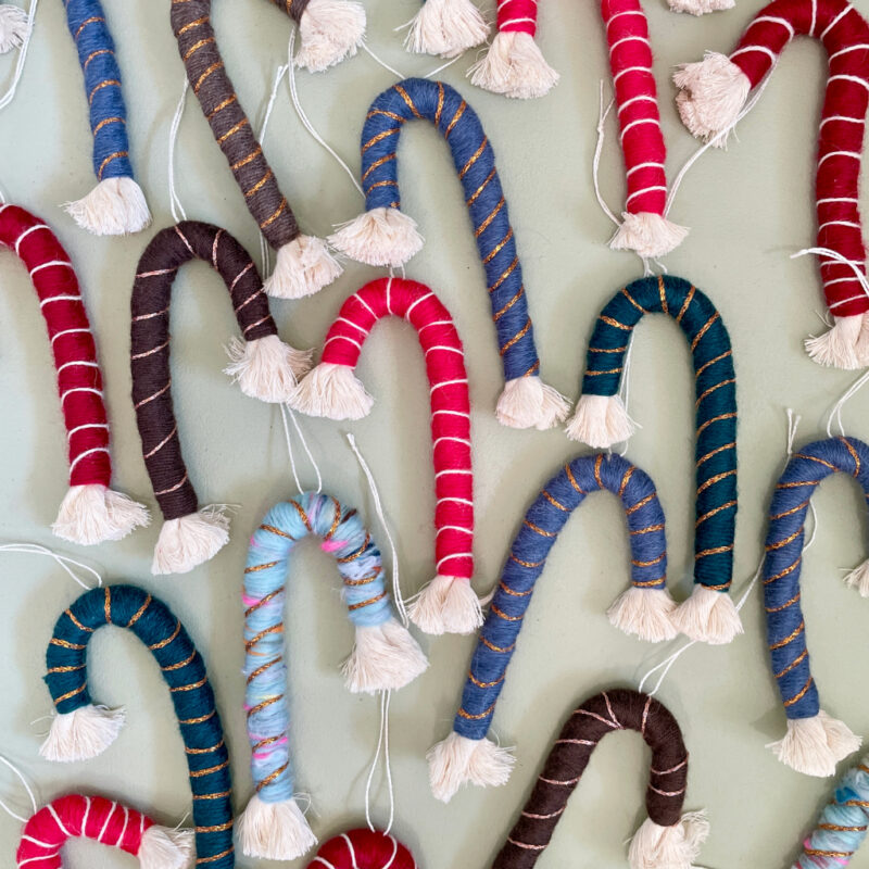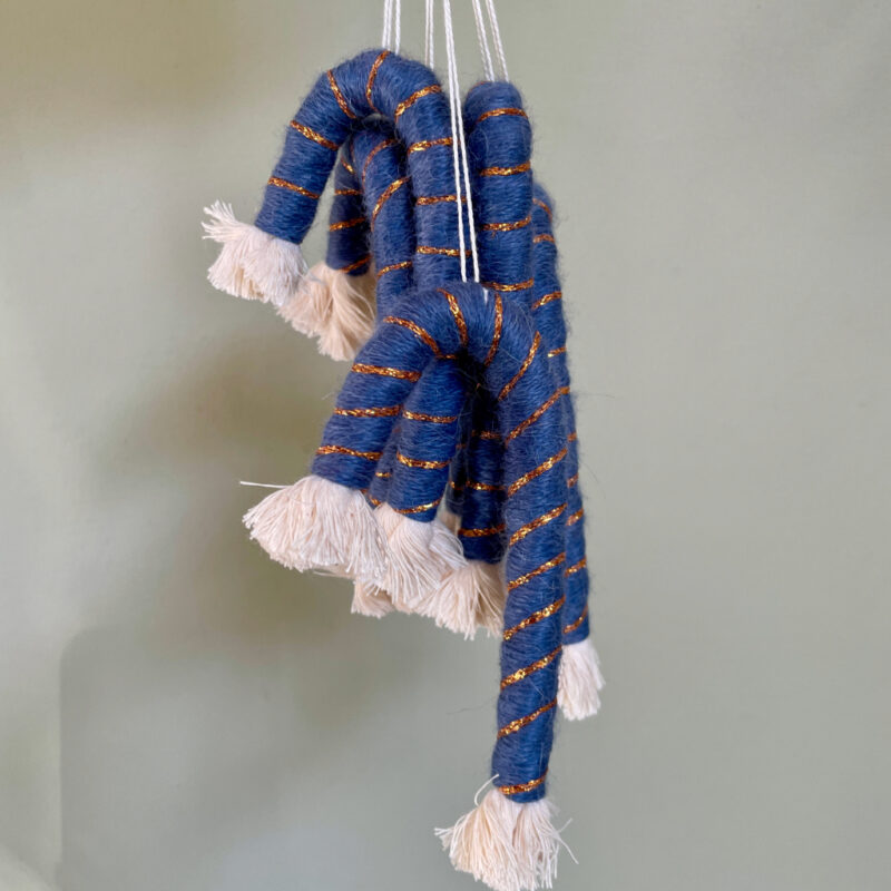 Skab julestemning med disse smukke, håndlavede julestokke, lavet af blødt bomuldsreb og garn. Hver stok måler ca. 11 cm og er omhyggeligt viklet i blåt garn og en elegant guldtråd, der giver et festligt og eksklusivt udtryk.