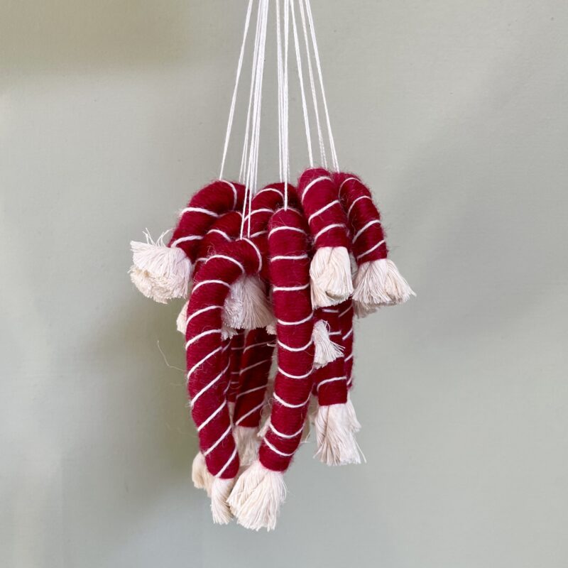 Skab julestemning med disse smukke, håndlavede julestokke, lavet af blødt bomuldsreb og garn. Hver stok måler ca. 11 cm og er omhyggeligt viklet i dyb mørk rød med en klassisk hvid stribe, der giver et traditionelt, hyggeligt og varmt juleudtryk