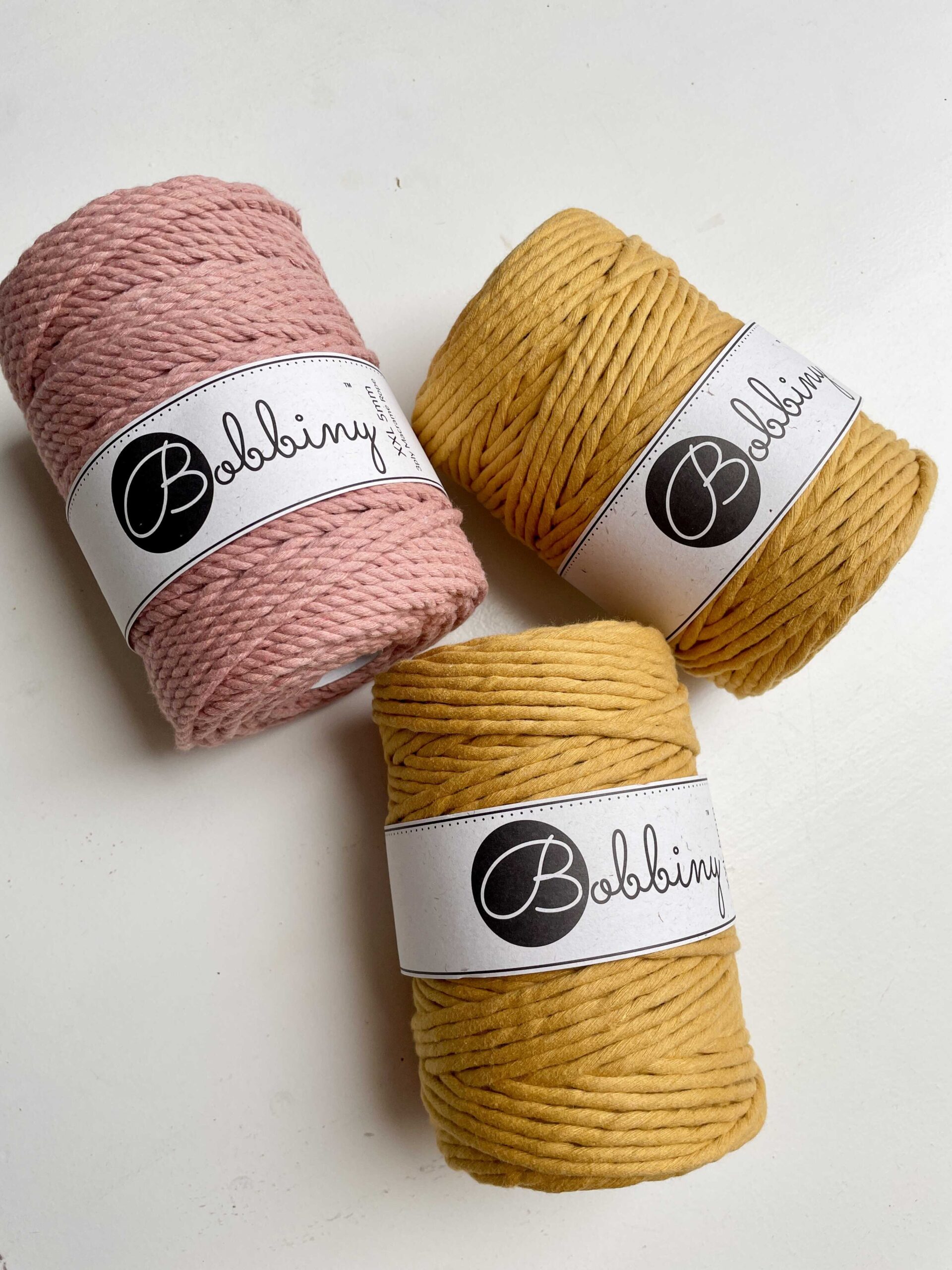 Bundle med 3 ruller macramé snor i varme, harmoniske nuancer — velegnet til vægophæng og kreative projekter.