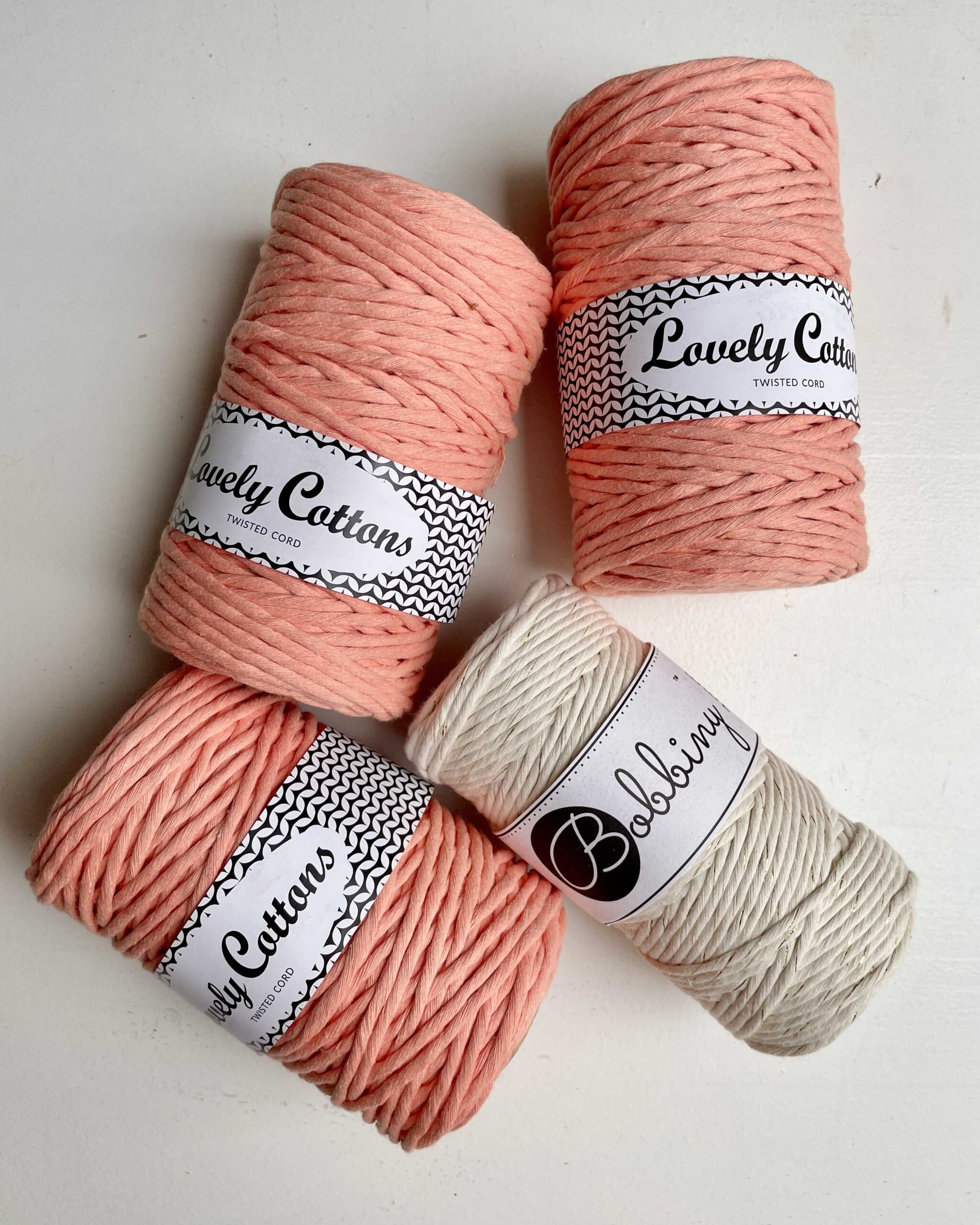 Bundle med 4 ruller twisted macramé snor i varme, bløde nuancer — velegnet til macramé og kreative projekter.