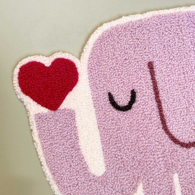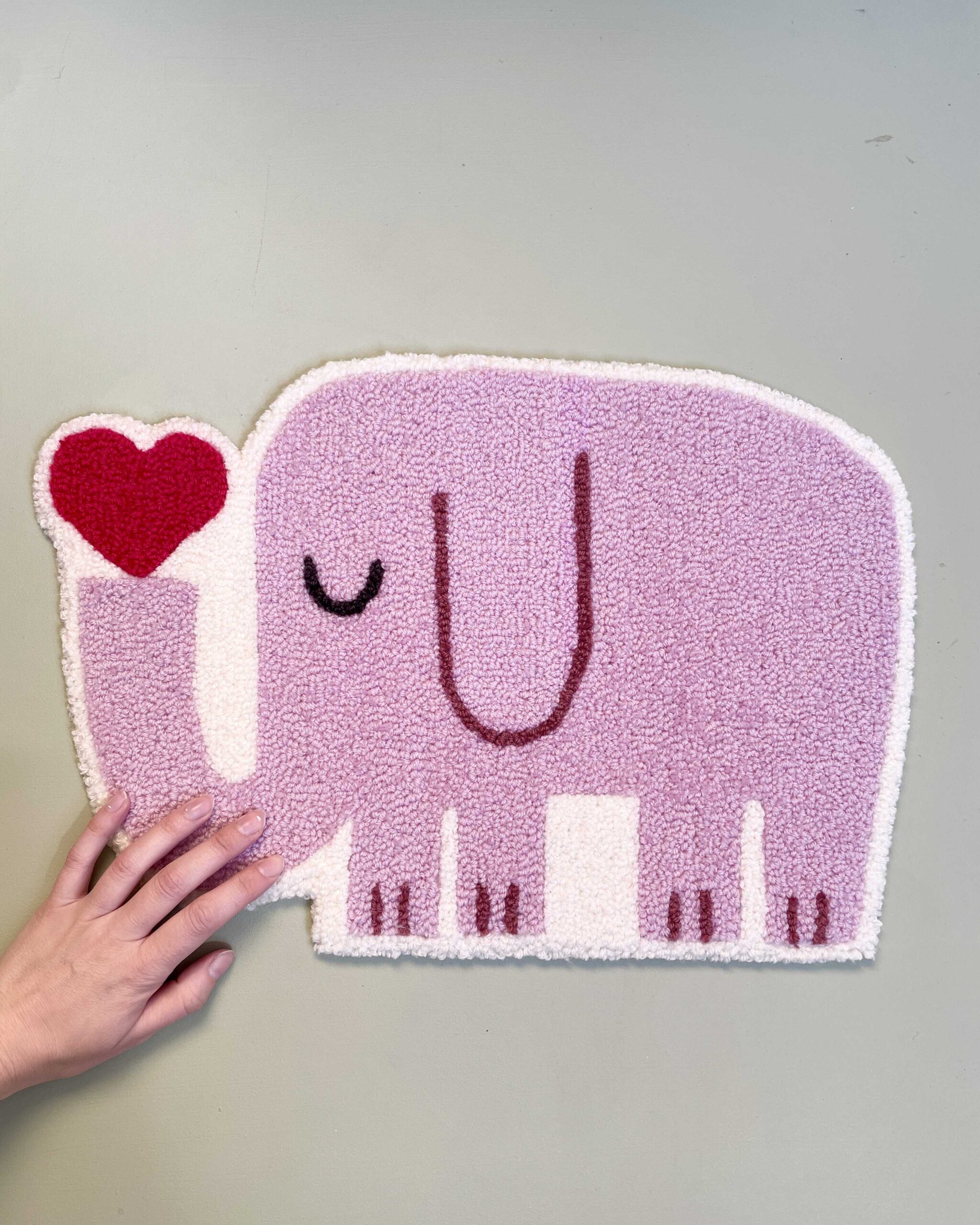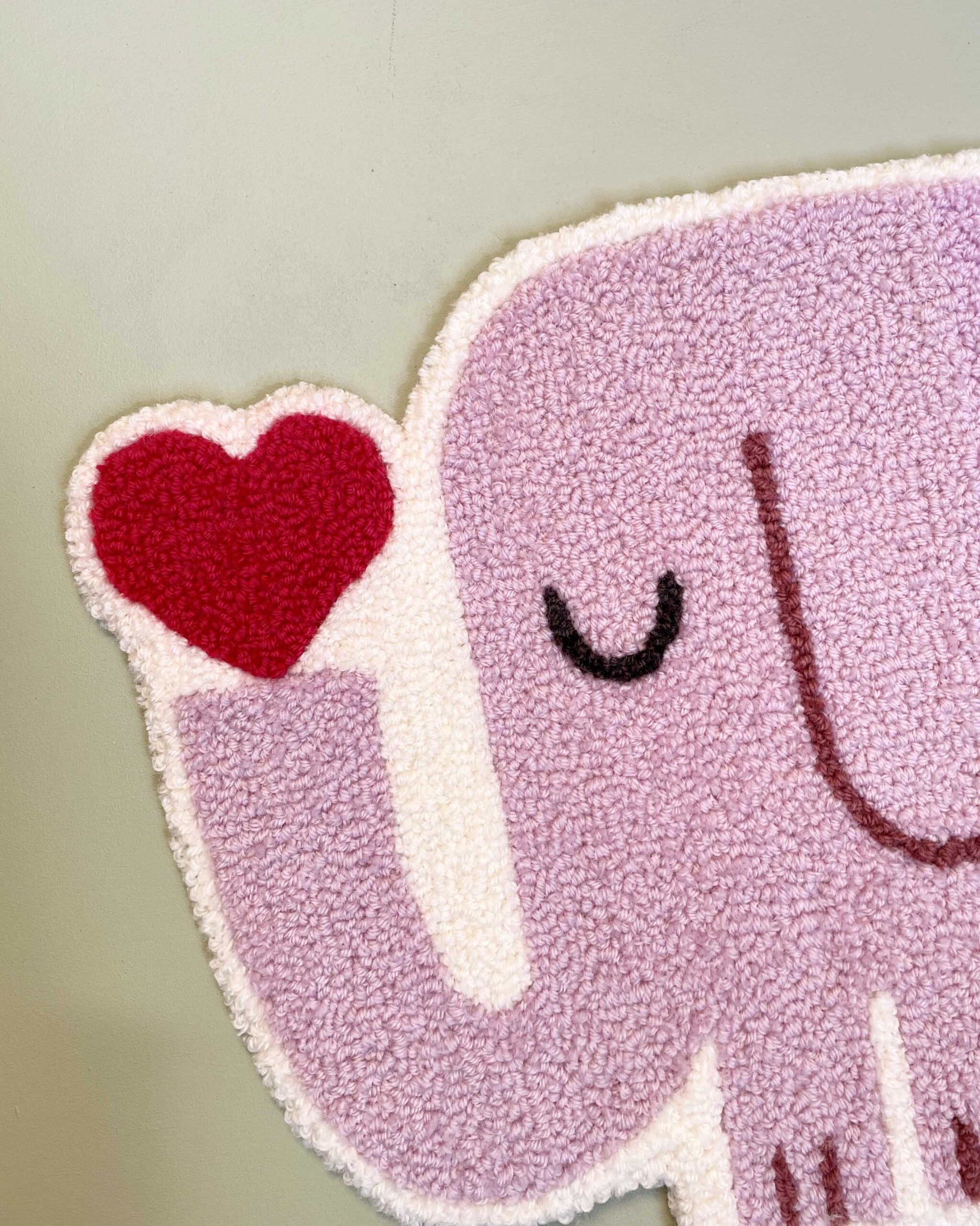 Den tuftede elefant er håndlavet i blødt uldgarn og fungerer som et dekorativt element på børneværelset. Den kan hænge alene som et roligt blikfang eller indgå sammen med andre værker og skabe en personlig væg, der vokser med barnet.